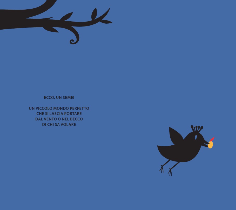 Racconta il mistero della crescita: un piccolo seme viaggia portato dal vento, cade, sogna, tace… e da lui può nascere un albero diverso ogni volta: la quercia mestosa che dà riparo, il baobab che custodisce acqua, il ciliegio che chiama i bambini, la sequoia gigante.