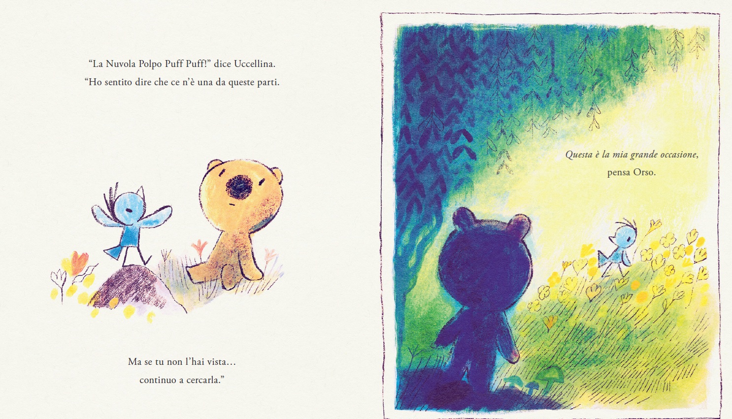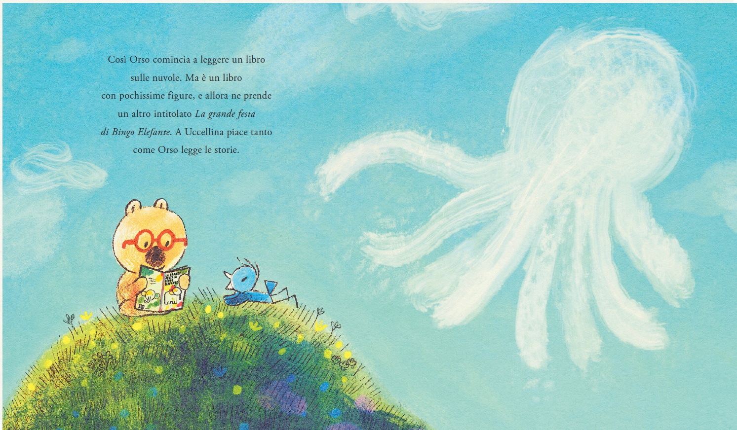 La giornata passa tra tentativi buffi per trovarla: un libro sulle nuvole, una festa a tema polpo, risate e canzoni. La Nuvola Polpo Puff Puff si vede? Forse sì... ma presi dallo stare insieme, Orso e Uccellina dimenticano di guardare il cielo. Quando Orso pensa di aver fallito, alzano gli occhi e vedono qualcosa che somiglia proprio a loro. Anche se non troveranno mai davvero la Nuvola Polpo Puff Puff, hanno trovato qualcosa di molto più importante: l’altro.