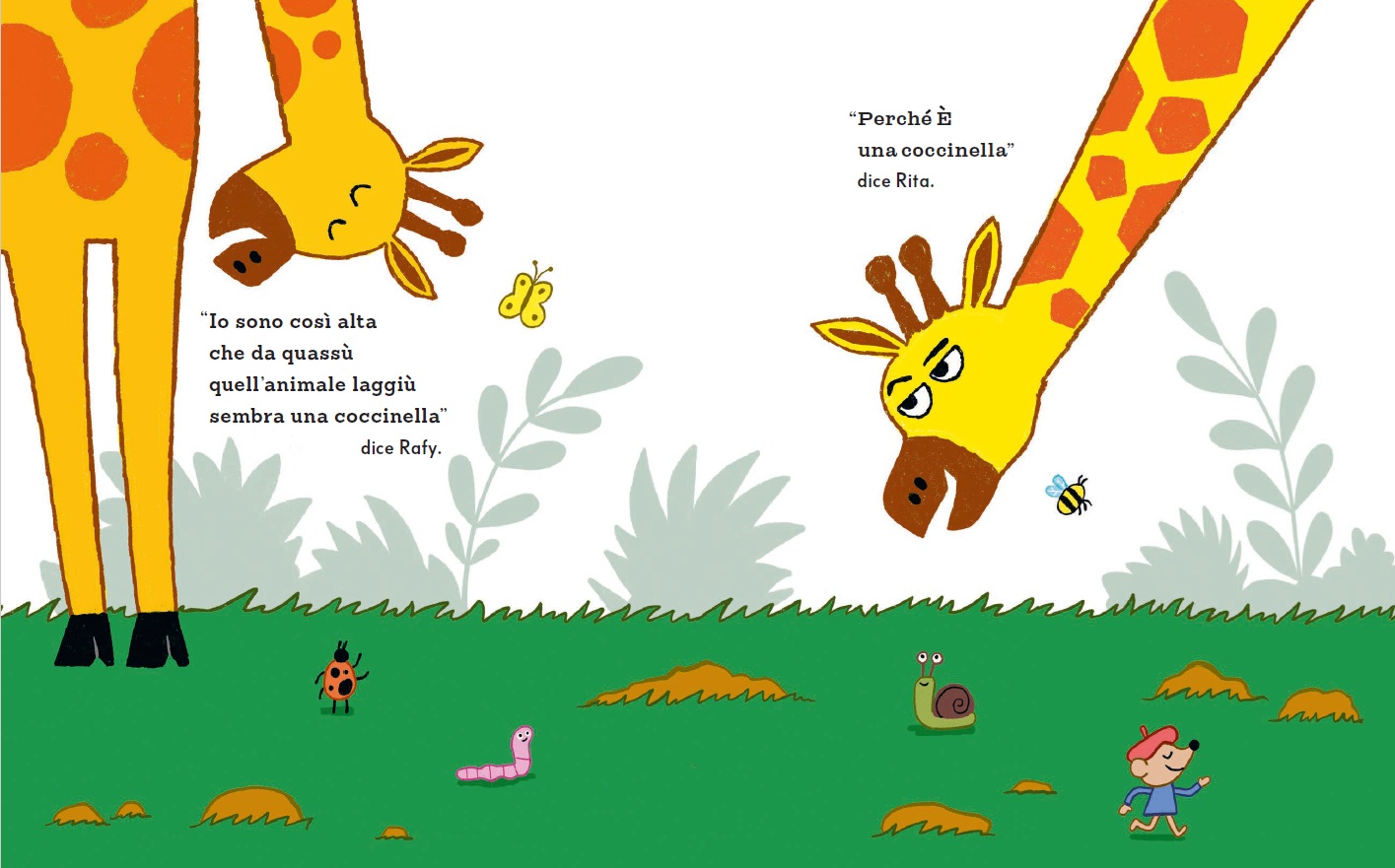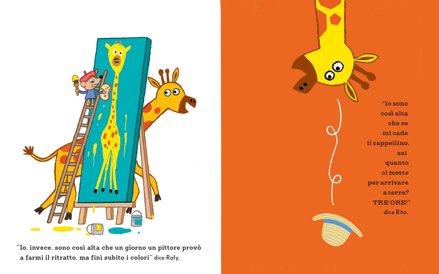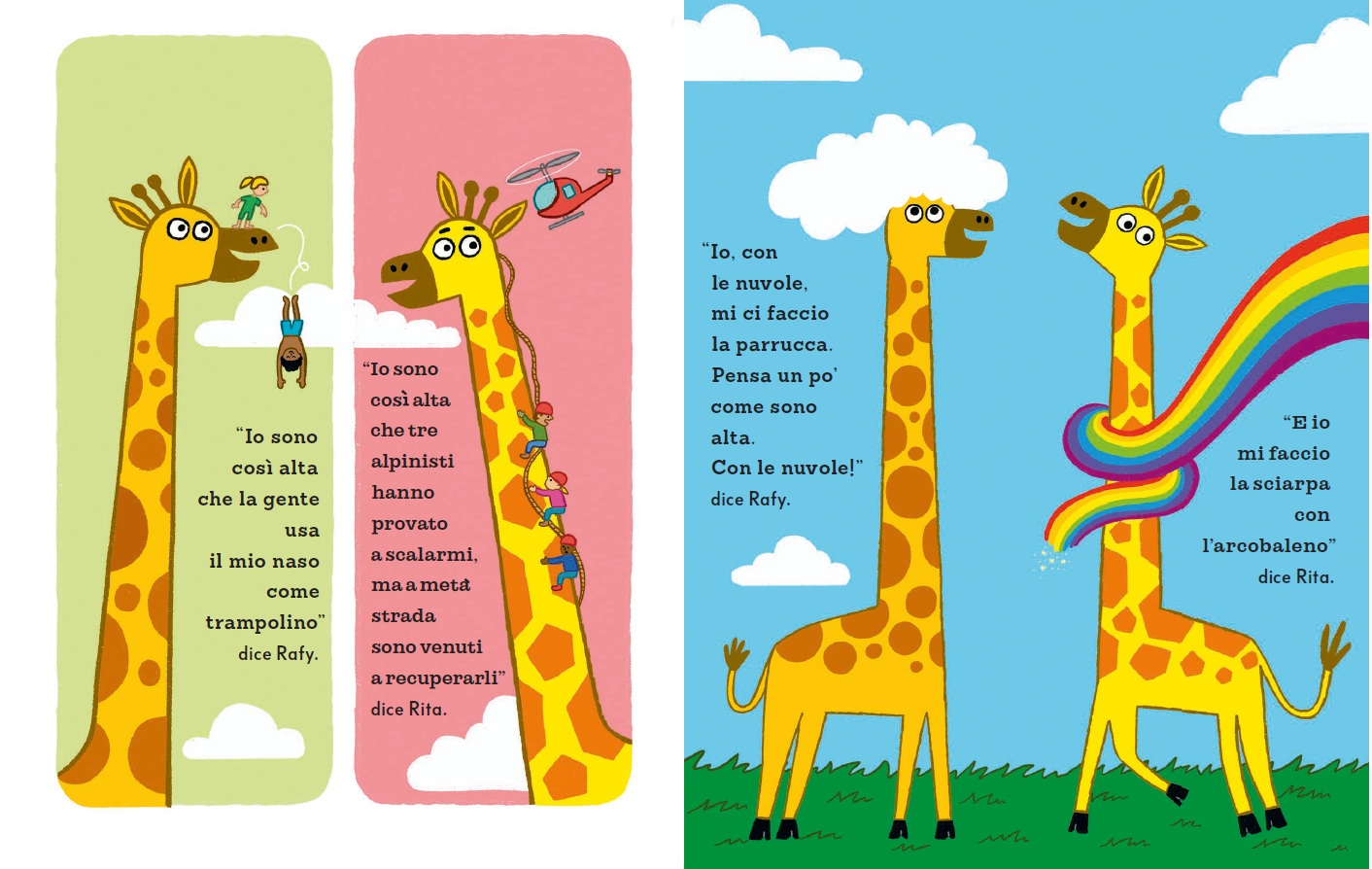 Rafy e Rita sono due giraffe gemelle: identiche in tutto… o quasi. Perché, a sentir loro, ognuna è sempre un pochino più alta dell’altra. E così, da una semplice provocazione, nasce una sfida irresistibile a colpi di fantasia.